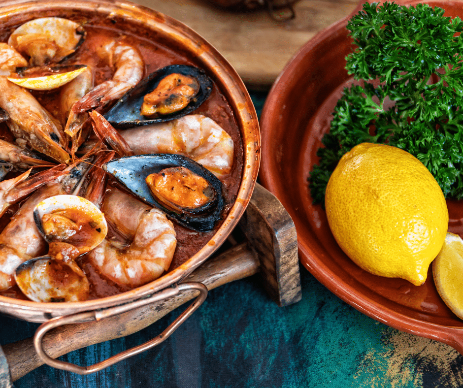 Cooked in a traditional copper pan, this dish combines clams, shrimp, fish, garlic, tomatoes, and herbs into a fragrant, steaming stew. It’s meant to be shared and enjoyed slowly.