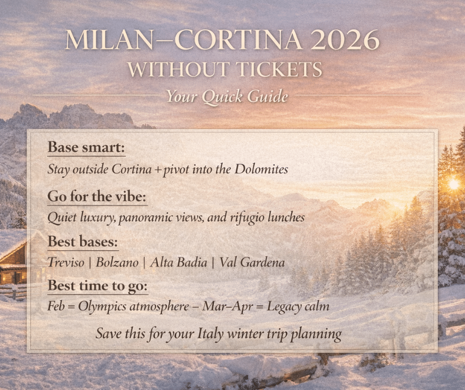 Whether you’re booking late or planning a “Legacy Trip” just after the Games, this Milan–Cortina 2026 Winter Olympics travel guide will show you how to do it well—without needing tickets.