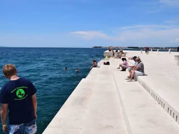 Simple and elegant steps, carved in white stone, were built on the quayside where there lies 35 musically tuned tubes with whistle openings on the sidewalk. The movement of the sea pushes air through, and depending on the size and velocity of the wave musical chords are played. The waves create random harmonic sounds which you can hear while enjoying the surrounding natural beauty and one of Zadarโs famed sunsets.